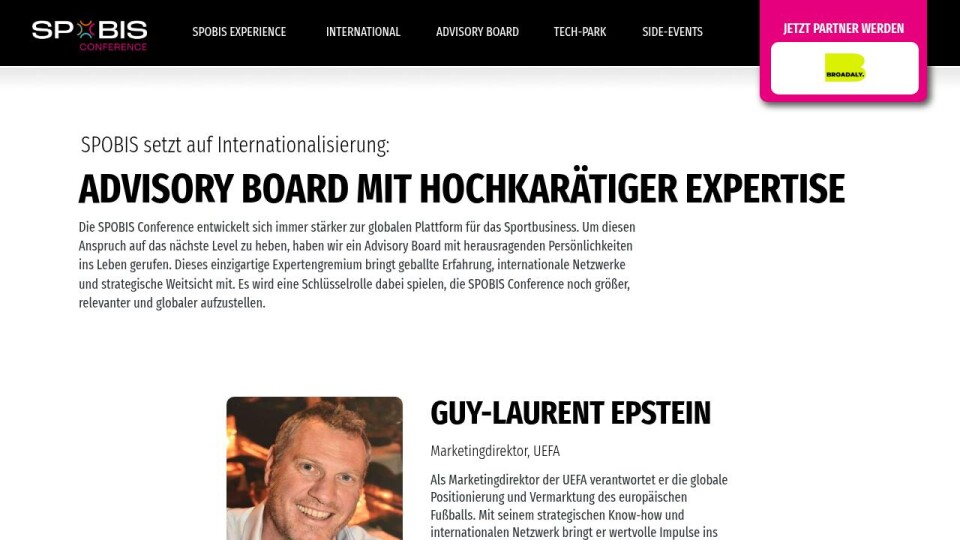 Die SPOBIS Conference entwickelt sich immer stärker zur globalen Plattform für das Sportbusiness. Um diesen Anspruch auf das nächste Level zu heben, haben wir ein Advisory Board mit herausragenden Persönlichkeiten ins Leben gerufen. Dieses einzigartige Expertengremium bringt geballte Erfahrung, internationale Netzwerke und strategische Weitsicht mit. Es wird eine Schlüsselrolle dabei spielen, die SPOBIS Conference noch größer, relevanter und globaler aufzustellen.
