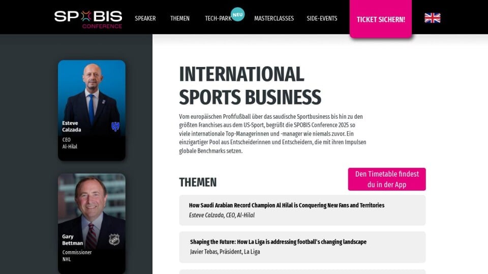 Vom europäischen Profifußball über das saudische Sportbusiness bis hin zu den größten Franchises aus dem US-Sport, begrüßt die SPOBIS Conference 2025 so viele internationale Top-Managerinnen und -manager wie niemals zuvor. Ein einzigartiger Pool aus Entscheiderinnen und Entscheidern, die mit ihren Impulsen globale Benchmarks setzen.